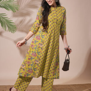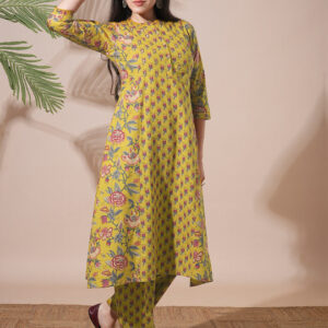 Allover Printed Pleated & Panelled A-Line Kurta With Narrow Pants Workwear Set