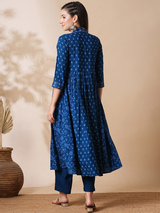 Allover Printed Pleated & Panelled A-Line Kurta With Narrow Pants Workwear Set