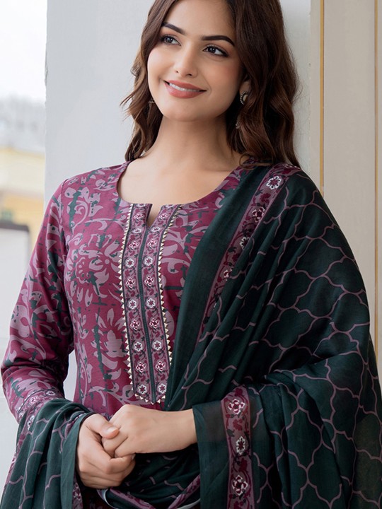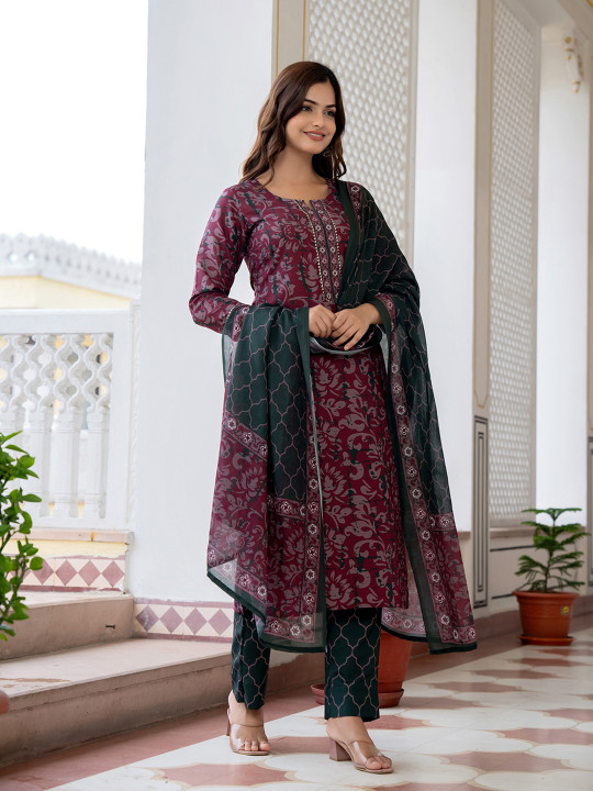 Floral Printed Notch Neck Straight Kurta With Trousers & Dupatta