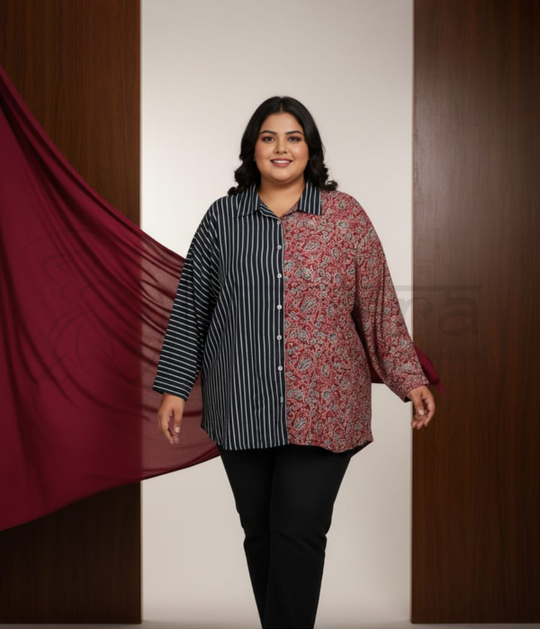 An Ajrak-tuned top designed in a contemporary fusion silhouette that blends traditional craft with modern tailoring. The top features a classic shirt collar with a full front button placket, giving it a structured yet relaxed appearance.