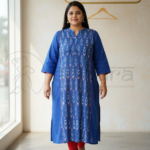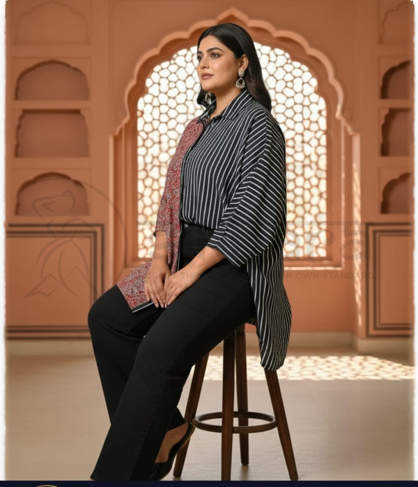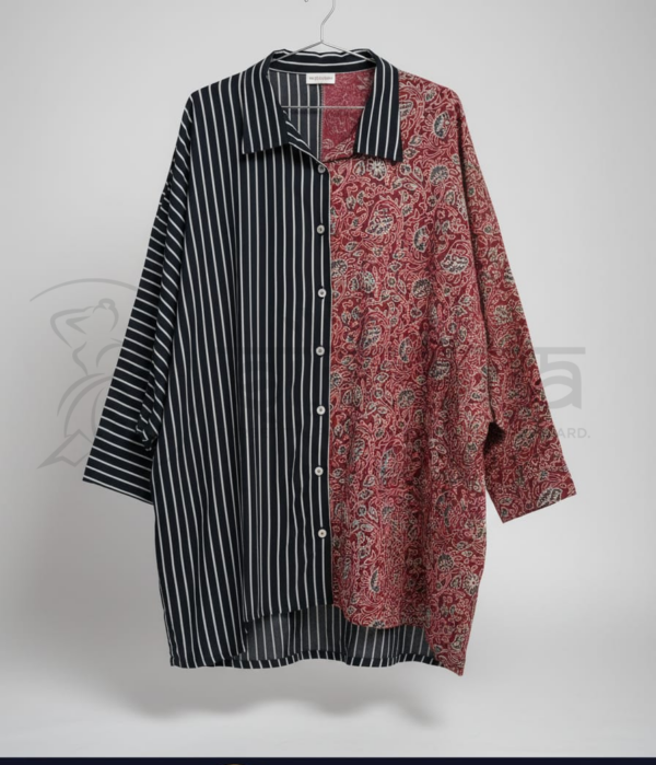The silhouette is loose and slightly oversized, offering comfort and an effortless drape. Full-length sleeves and a straight hemline enhance its versatile styling appeal. Crafted in breathable cotton or cotton-blend fabric, this Ajrak tuned top is ideal for casual wear, creative workspaces, and Indo-western styling, pairing well with trousers, denims, or ethnic bottoms.