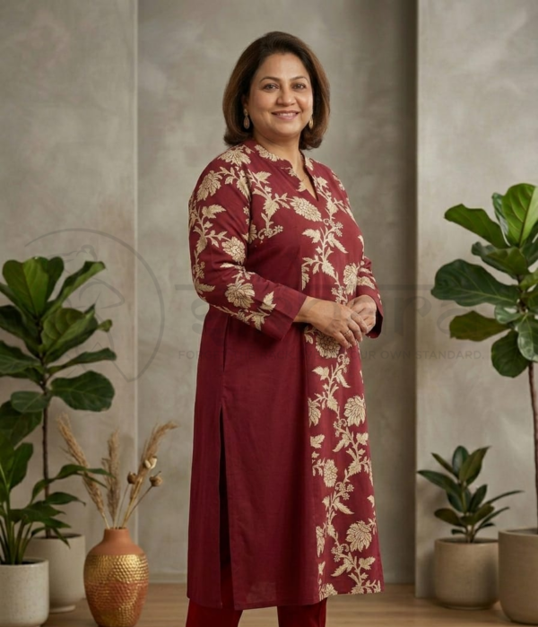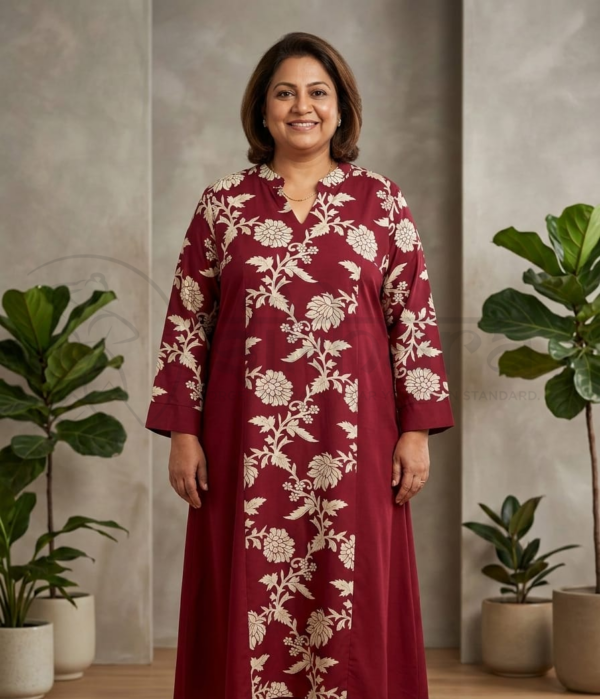 Refresh your everyday ethnic style with this elegant maroon floral printed kurta. Designed with a graceful A-line silhouette, this piece features a subtle notched round neckline and three-quarter sleeves for a refined, timeless appeal. The contrasting beige botanical print adds sophistication while keeping the look versatile and easy to style.