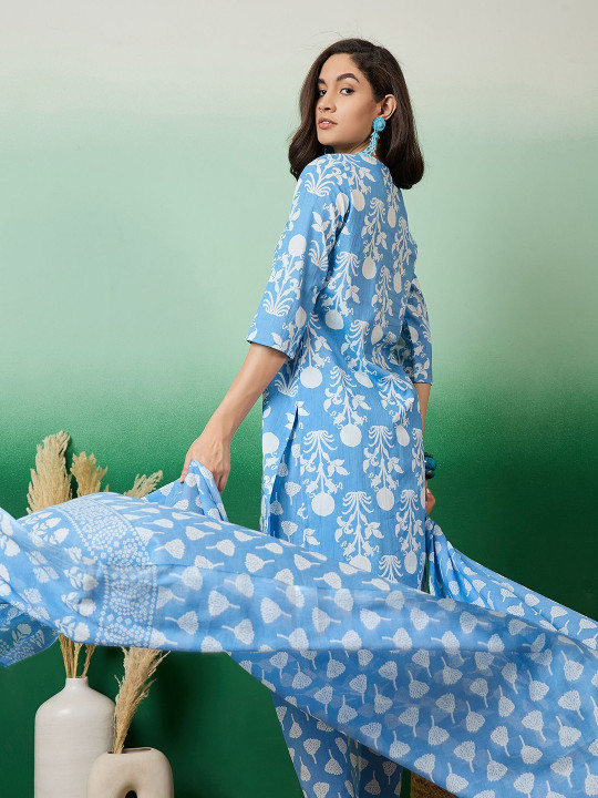 Printed & Embroidered Pure Cotton Straight Kurta With Trouser & Dupatta Set