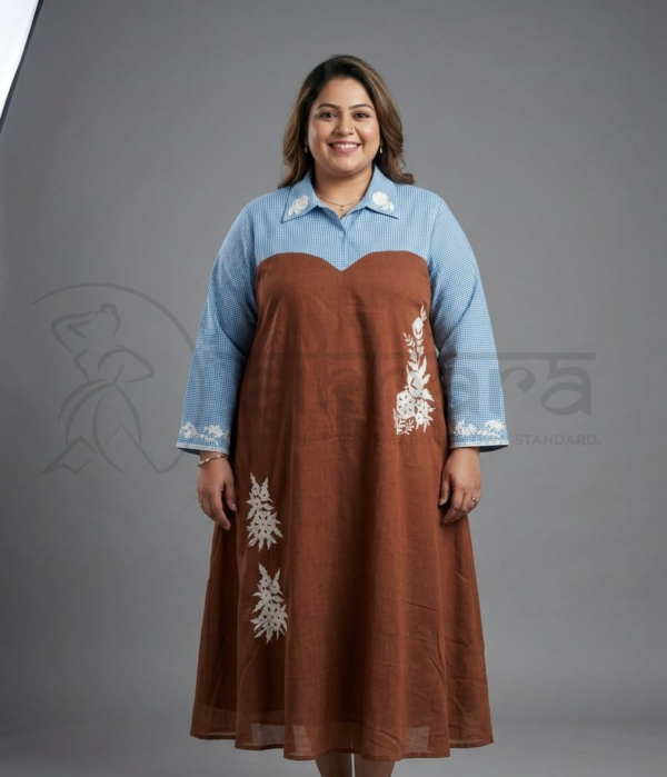 The dress features a unique two-tone design, combining a soft blue gingham-checked upper bodice with a rich earthy brown flared lower panel. The upper portion is styled with a classic shirt collar and buttoned neckline, giving it a structured and polished look.