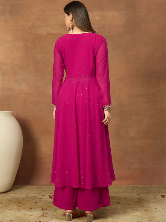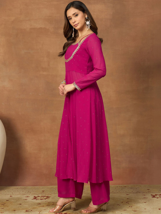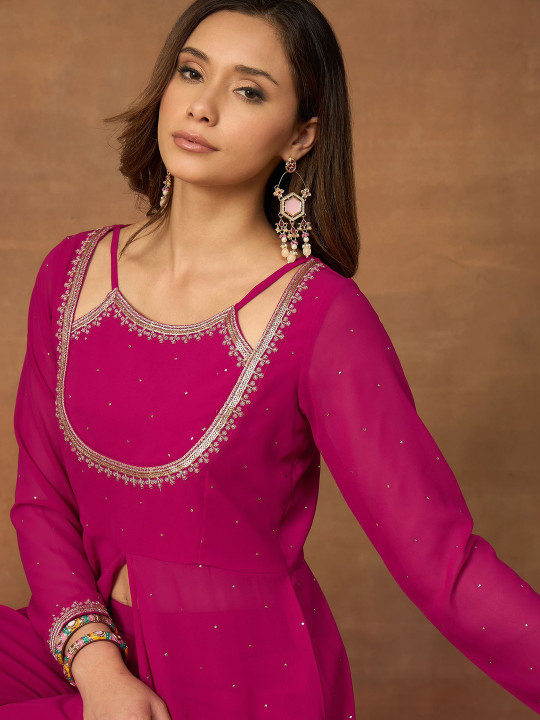 Magenta Floral Embroidered Zari Anarkali Kurta With Trouser & Dupatta